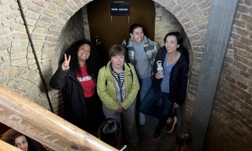 Herefter gik turen videre til Viborg Domkirke, hvor vi blev vist rundt i den storslåede kirke. De smukke kalkmalerier gjorde stort indtryk, og flere kursister kunne genkende historierne bag motiverne – selvom de ikke nødvendigvis deler samme religion. Turen bød også på en tur op i tårnet med udsigt over byen.