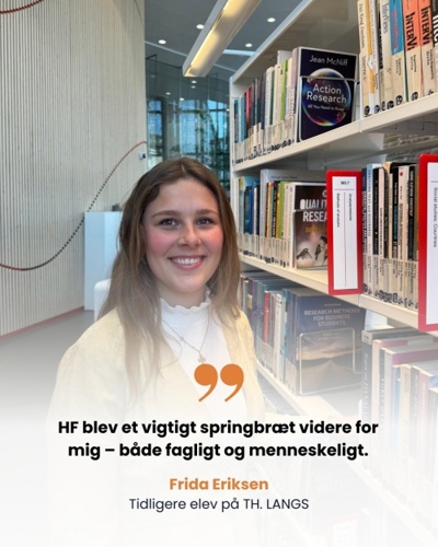 Hvis du trives bedst på en mindre skole, hvor der er faglighed og plads til den enkelte, så er HF på TH. LANGS et rigtigt godt valg. Jeg havde selv prøvet en anden ungdomsuddannelse først, men følte mig slet ikke til rette. Det var noget helt andet at starte på HF her på skolen.